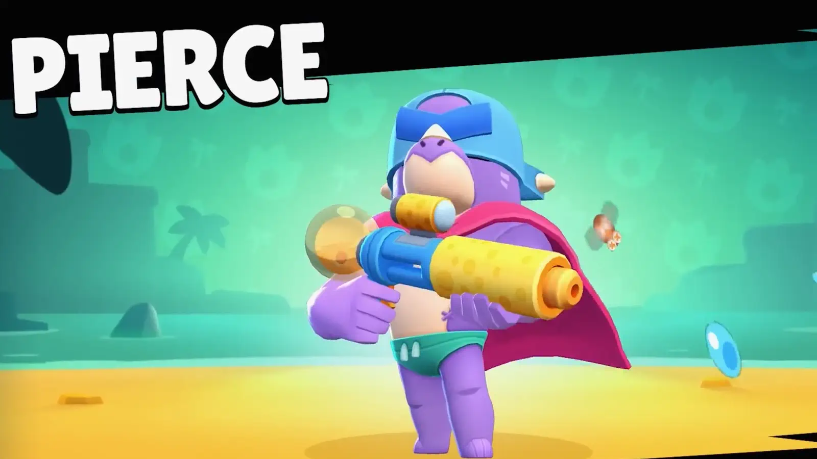 La super marchia i nemici in un’area specifica e li colpisce con proiettili a ricerca. Ogni colpo della super genera una boccia che Pierce può raccogliere per continuare a sparare. I gadget e le abilità stellari offrono supporto aggiuntivo rallentando i nemici o assorbendo i danni. Pierce è il primo brawler leggendario pubblicato durante un evento di rilascio dedicato.